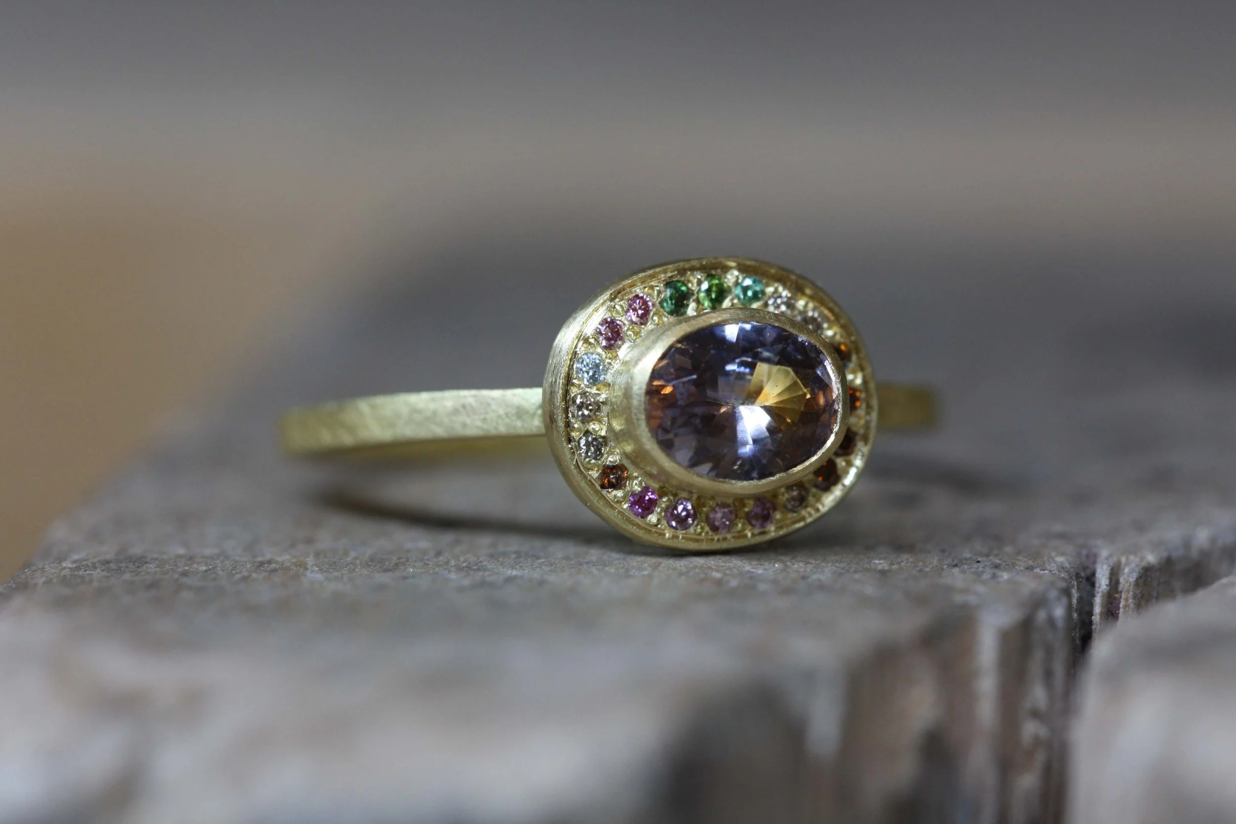 We created this bespoke ring for Georgina using a selection of heirloom stones and a new colour-changing green-to-purple sapphire. The ring was made using a mixture of heirloom gold of different carats to create a unique colour of gold that provided a warm orange-yellow.